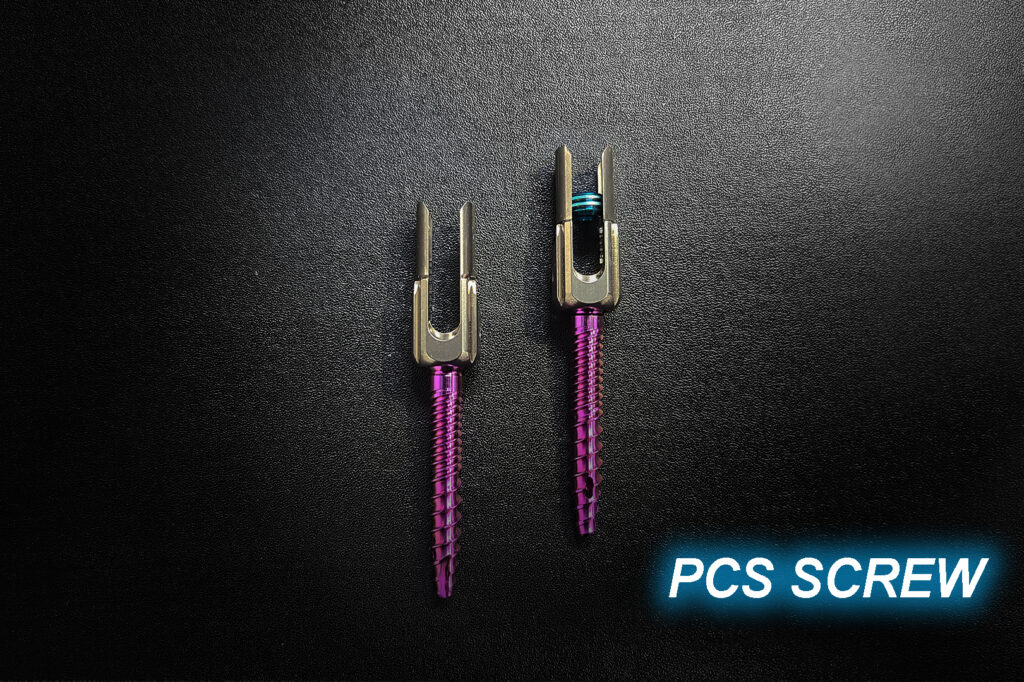 Double-threaded cortical screw designed for minimally invasive surgery. It features a hollow structure with side holes for bone cement injection. The screw shaft is color-coded based on different diameters.